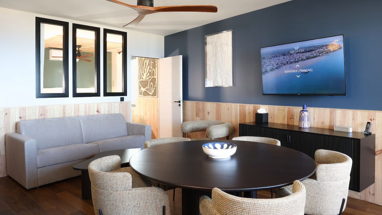 Nos Suites Vue Mer disposent d’une superficie de 70m² pouvant accueillir deux à six personnes et offrent une vue panoramique sur le bassin d’Arcachon. Elles sont composées de deux chambres séparées avec lit king size, disposant chacune d’une salle de bain indépendante avec douche à l’italienne ou baignoire, d’une cuisine toute équipée, d’un coin salon avec canapé-lit et d’une terrasse pour profiter pleinement de la vue sur la mer.